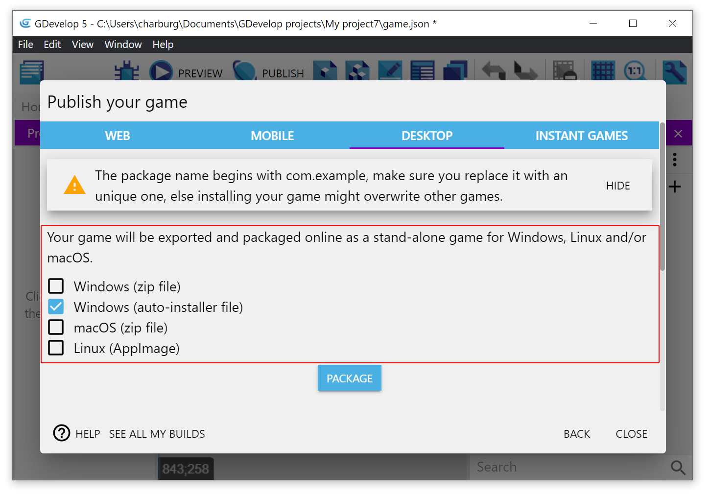 GDevelop can publish games to Windows, macOS, and even Linux!