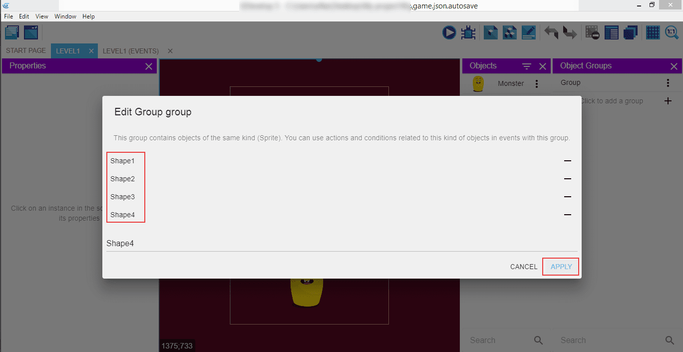 Do the same for the second shape: "Shape2" as the name, "NewObject2" as the animation, and a square image, then "Apply".