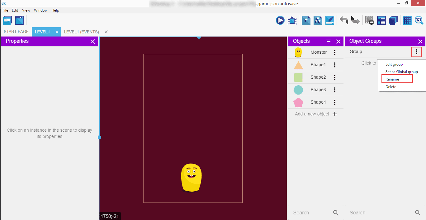 Now click on the three vertical dots next to the "Group" in the "Object Groups" panel to open a context menu and click "Rename".